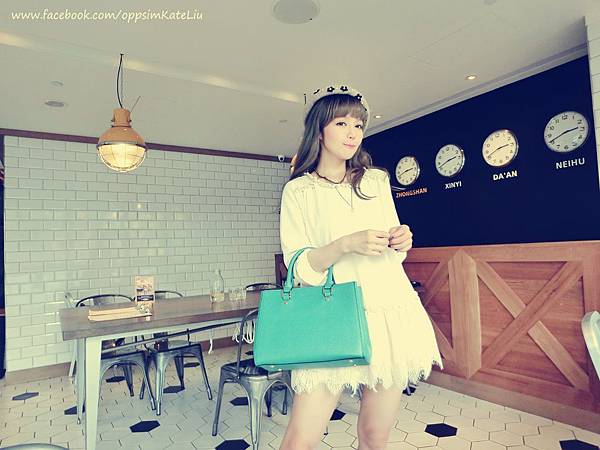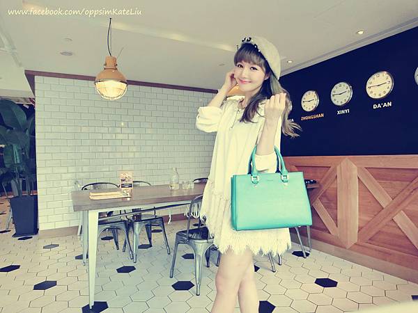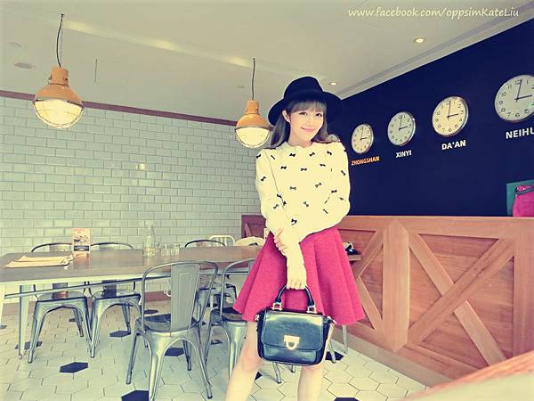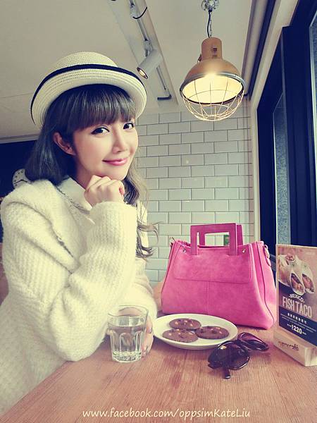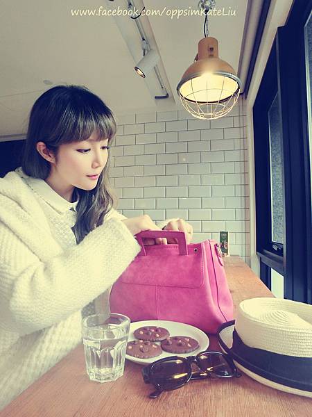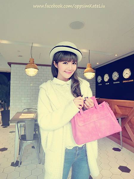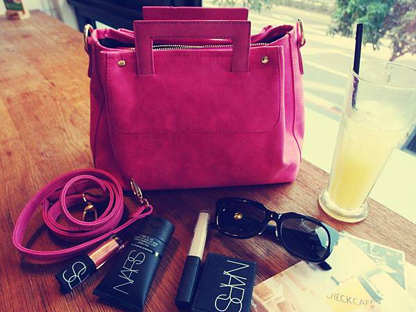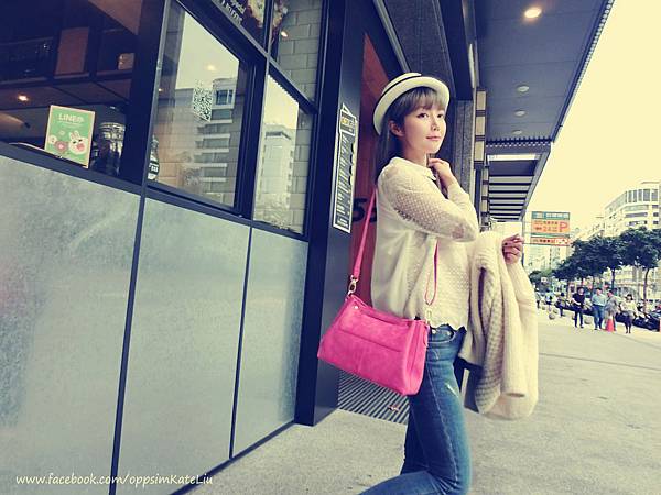 所以你可以看到丹寧褲的藍色與桃紅色包包相呼應
