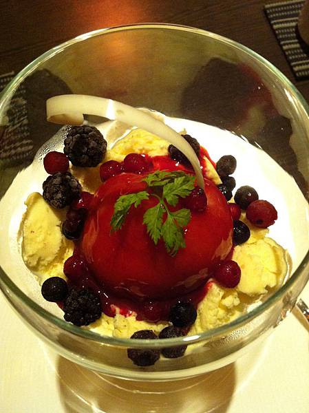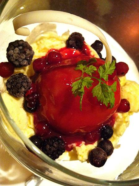 淋上野苺醬汁跟桑葚藍莓果粒,